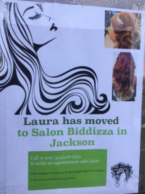 On a side note – one of the stylists, Laura, has relocated. Her clients can find her at Salon Biddizza in Jackson. Call or text 414-416-9231.