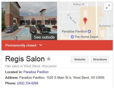 Feb. 2, 2017 – West Bend, WI – Regis Hairstylists in the Paradise Pavilion has closed. All that remains is an empty storefront and shadows of the lettering on the building facade.