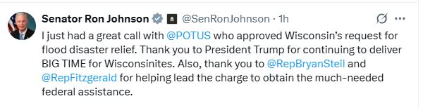 “I just had a great call with @POTUS who approved Wisconsin’s request for flood disaster relief. Thank you to President Trump for continuing to deliver BIG TIME for Wisconsinites. Also, thank you to @RepBryanSteil and @RepFitzgerald for helping lead the charge to obtain the much-needed federal assistance.”