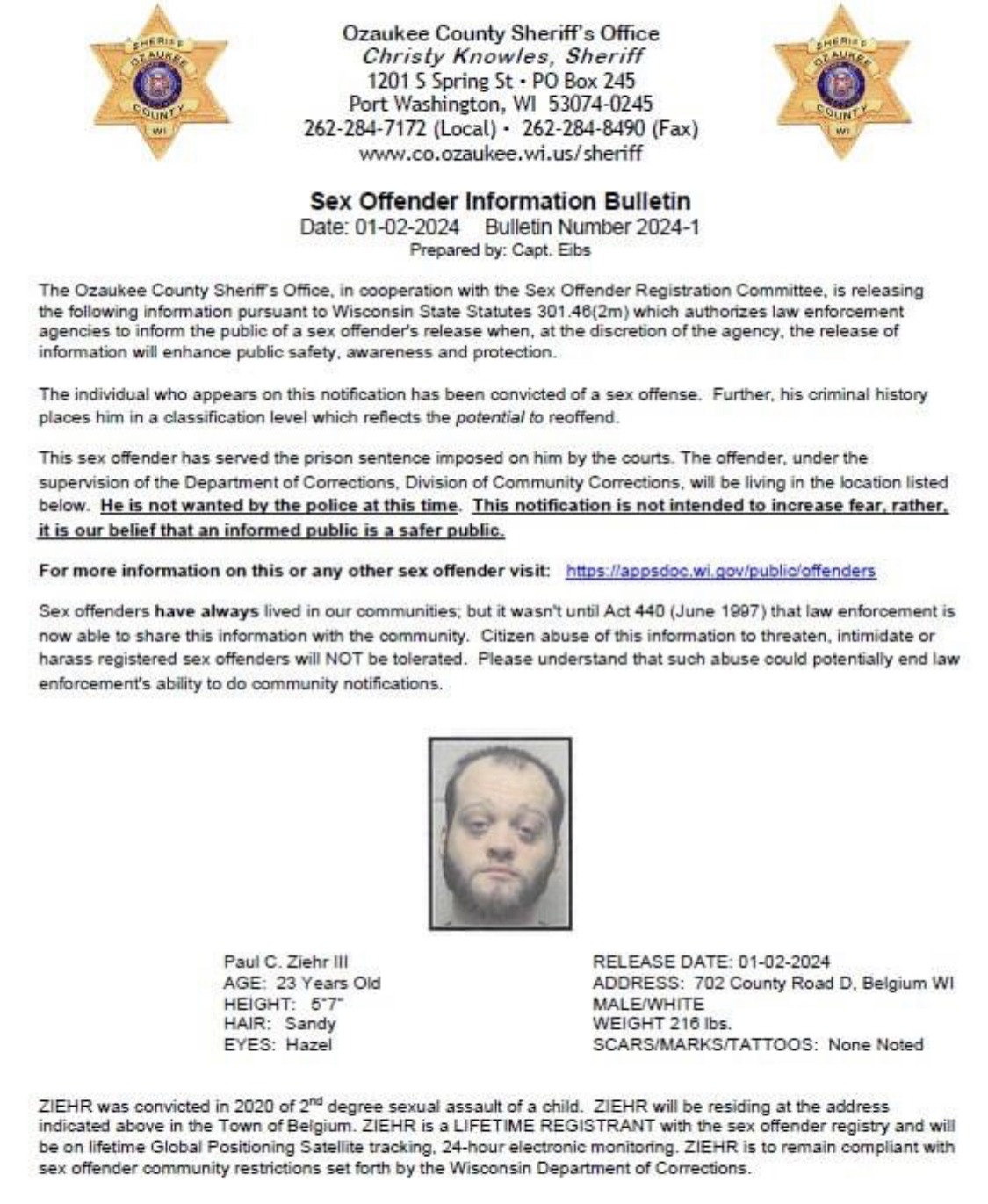 January 2, 2024 – Ozaukee, WI – Man convicted of 2nd degree sexual assault of a child to be released in Town of Belgium. Notification from Ozaukee County Sheriff is below.