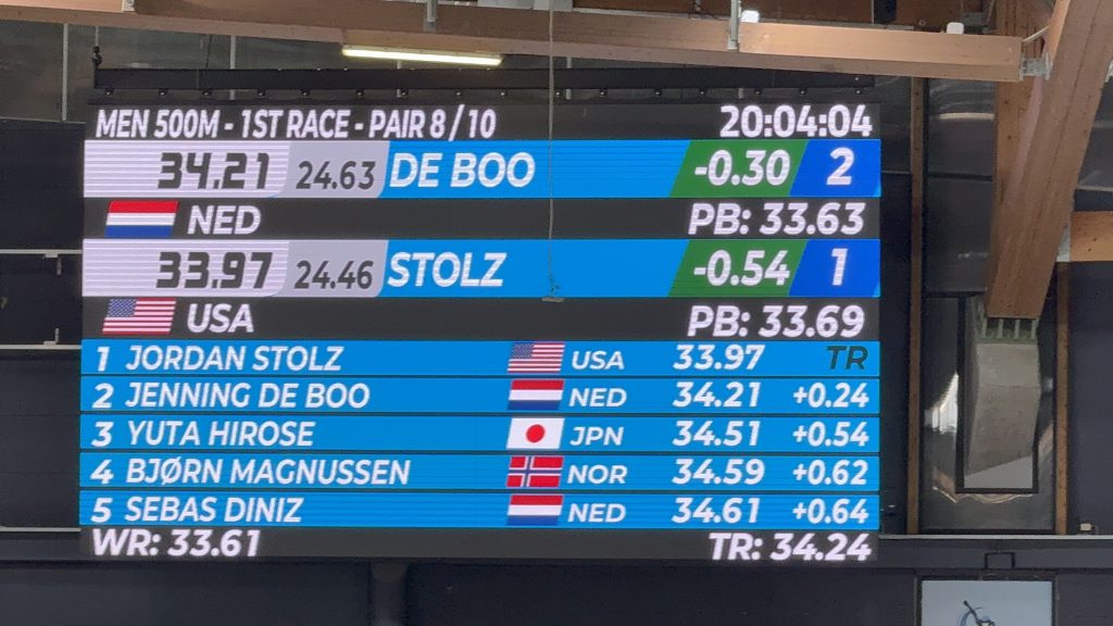 Corby praised Stolz’s resilience in the tight 500/1500 double. “They all bounce back. He’s just the better bouncer,” he said. “I could see he was tired because the high-end speed in the beginning wasn’t there.”