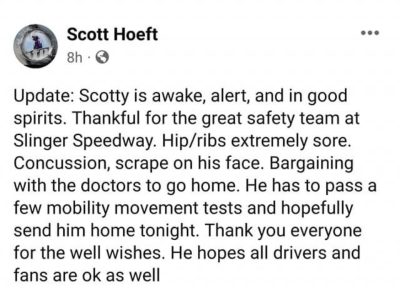 Flagman Scott Hoeft was examined and released from the hospital last night after some mobility tests. He is obviously sore today. Scott is very thankful for the great safety team at Slinger Speedway, Lifestar, and the Slinger Fire Department who happened to be on-site for the fireworks.