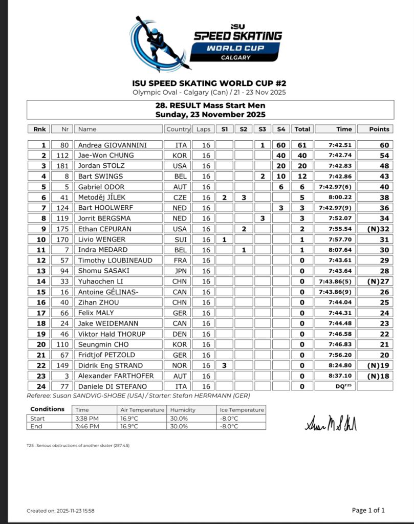 November 24, 2025 – Calgary, CA – Jordan Stolz added two more medals to his fast-growing World Cup résumé over the weekend, claiming gold in the 500m and securing his first career Mass Start podium with a gritty bronze at the ISU World Cup in Calgary.