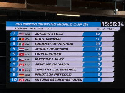 December 14, 2025 – Hamar, Norway – It’s the final skate today at the ISU World Cup in Hamar, Norway and for Jordan Stolz that means two events, the 500m and the Mass Start.