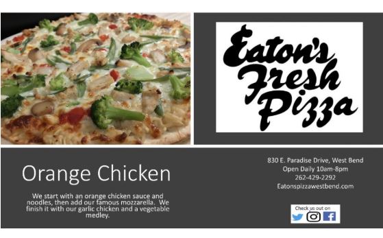 Eaton’s Fresh Pizza featuring Orange Chicken Pizza in February