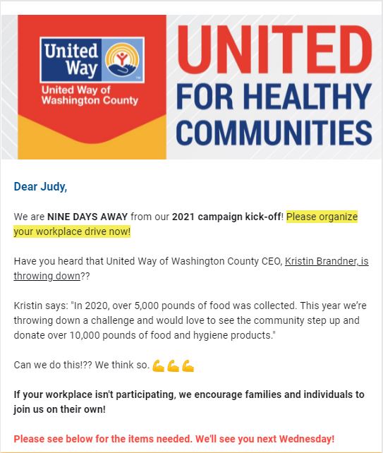 West Bend, WI – The United Way of Washington County is encouraging businesses and organizations to mark their calendar for the Food and Hygiene Drive on September 22, 2021 at Washington County Fair Park.