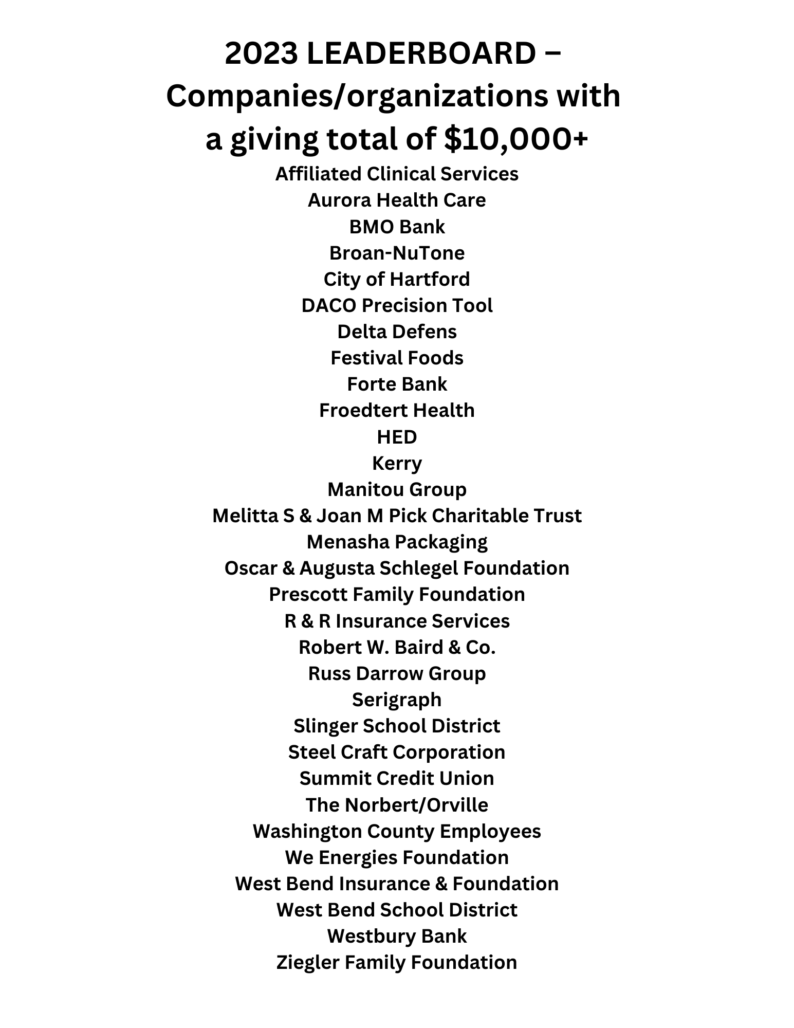 CLICK HERE to read the 2023 LEADERBOARD – Companies/organizations with a giving total of $10,000+