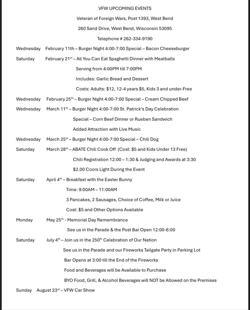 West Bend, Wi – Check out the activities at the VFW on Sand Drive in West Bend, Wi. Mark your calendar for Burger Nights, Breakfast with the Bunny, VFW Car Show and more…