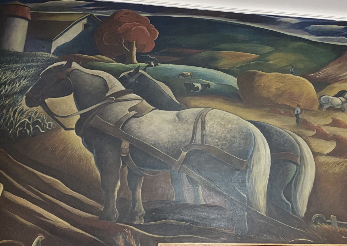 The painting is titled “Wisconsin Rural Scene” and depicts local farmer Maurice Ryan, dressed in blue coveralls, working the field with his twin sons.