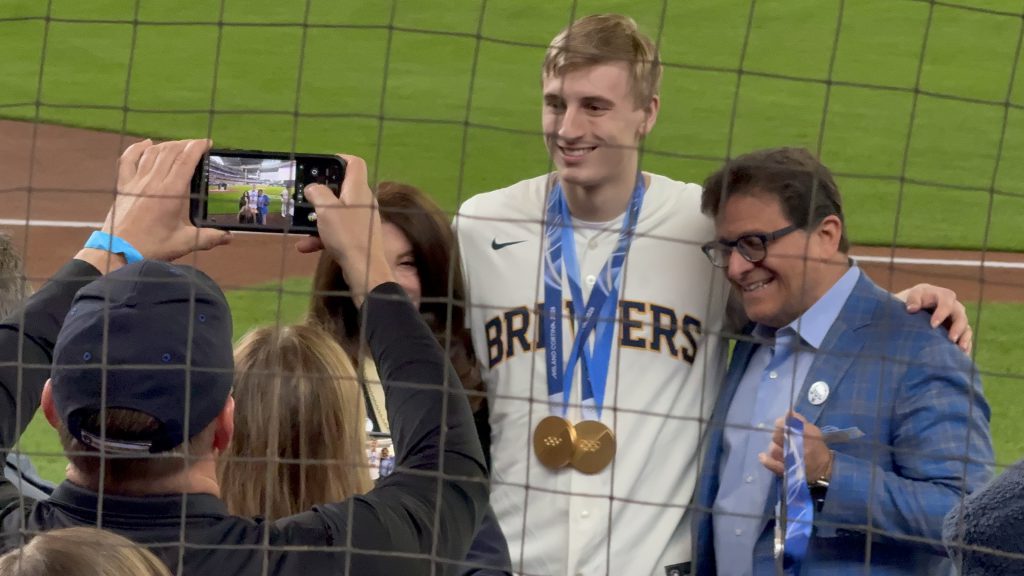 Sporting a Brewers jersey No. 26 (for the 2026 Winter Olympics) Stolz tucked his gold medals in his pocket and let go a solid throw to homeplate.