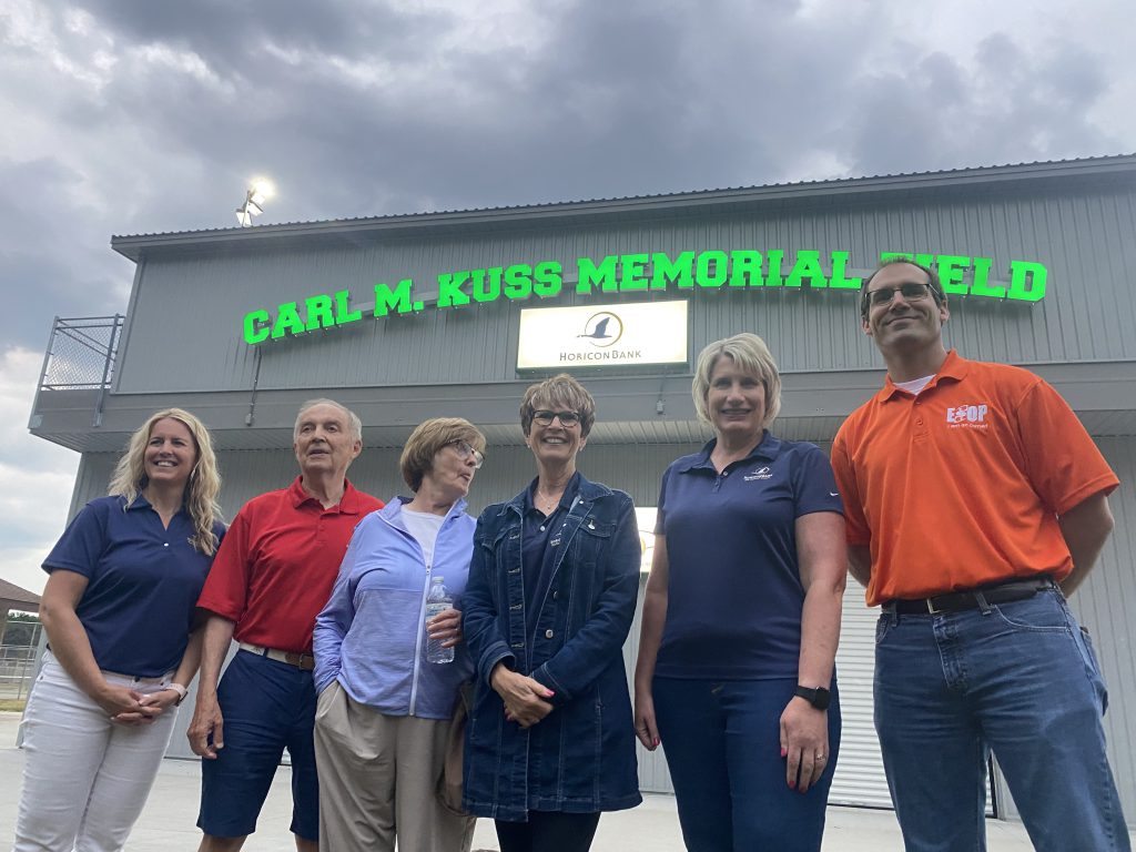 Team members from Horicon Bank celebrated the addition of the lighted signage to the press box at Carl M. Kuss Memorial Field.