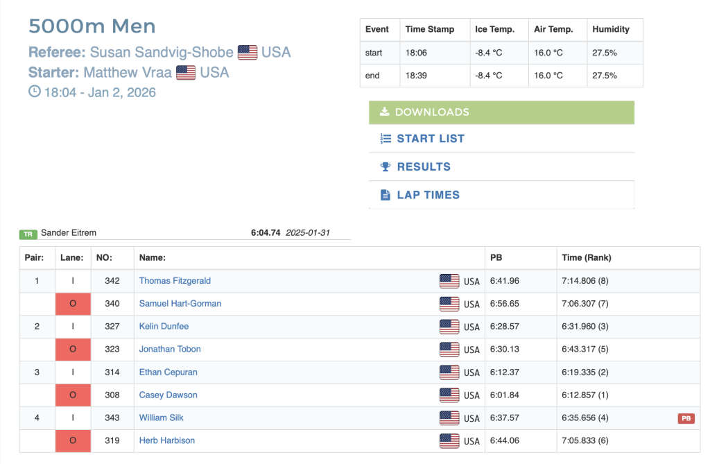 Early prediction – watch for Casey Dawson to qualify for the 5000m. His personal best is 6:04.40. Dawson skates in the third pairing this afternoon.