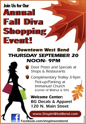 Sept. 19, 2018 – West Bend/Barton, WI – The Fall DIVA event is Thursday, Sept. 20 at shops and restaurants in downtown West Bend and Barton.