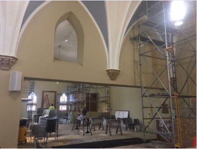 There’s still quite a bit of work left to be done as scaffolding that stretches to the ceiling is still in place and the hardwood floor is awaiting carpeting which should arrive in two weeks along with the statues.