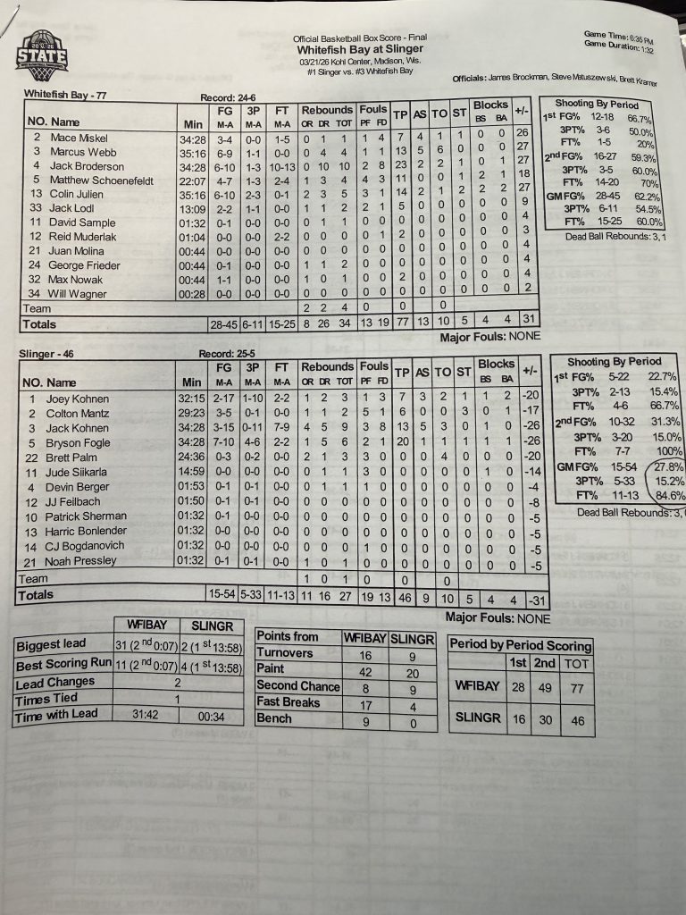 -Post-game stats show Slinger shot 27 percent from the field compared to WFB 62 percent.
