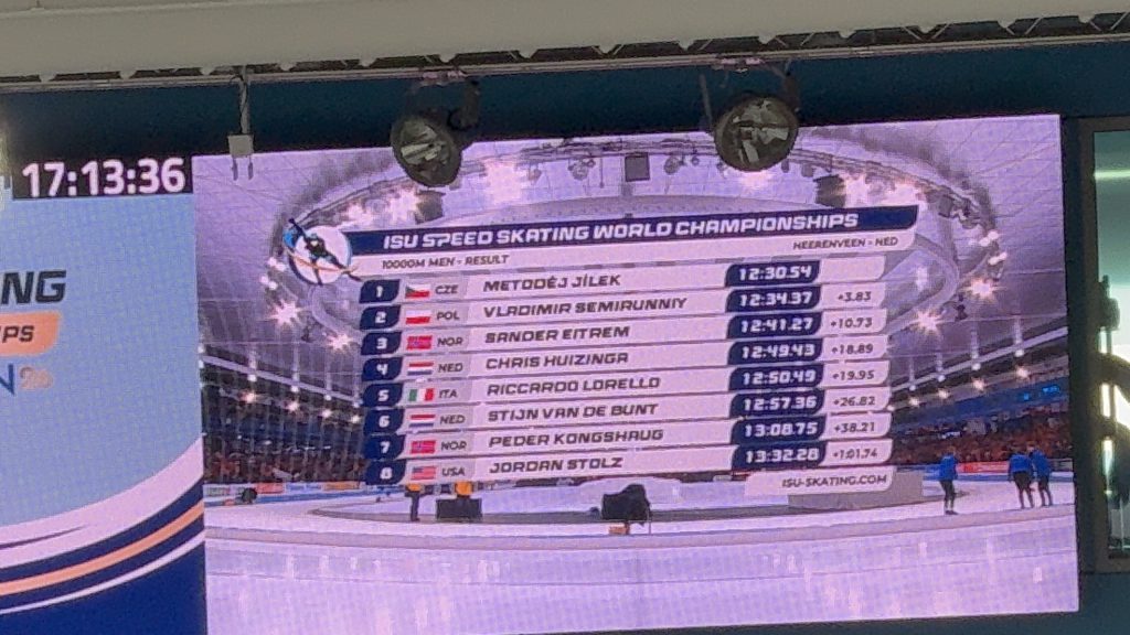 March 8, 2026 – Heerenveen, NL – It all came down to the last race at the World Allrounds and the pressure was on Jordan Stolz as a 10,000-meter competition was looming.