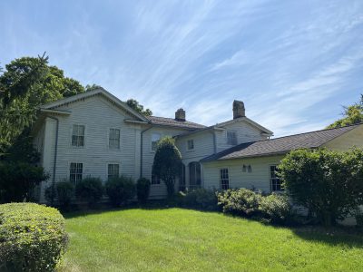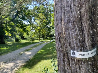 The stately White House is well hidden by mature trees and a long driveway. The tree closest to the road is marked “Do not cut – century tree.”