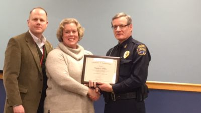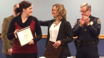 Heather Rank – On November 28, 2016, Heather Rank was driving in harsh winter weather on W. Washington Street when she saw a fifteen year old boy lying in the roadway near “Y” Drive. The boy had been struck by a car. Heather immediately stopped her car to protect the boy and provided first aid. Heather comforted the boy, kept him still, and stayed with him until the ambulance arrived. Heather is commended for her concern for a fellow human being and willingness to get involved. Her actions prevented the young man from being injured any further and provided comfort and reassurance to him during a traumatic event.
