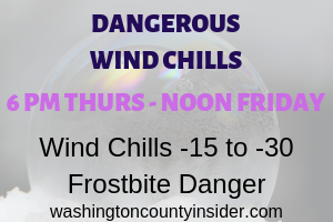 Jan. 24, 2019 – Washington County, WI – The National Weather Service has issued a wind chill advisory for all of southeast Wisconsin from 6 p.m. Thursday, Jan. 24 to noon Friday, Jan. 25. Very cold wind chills as low as 30 below zero are expected and could cause frostbite on exposed skin in as little as 30 minutes.